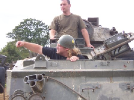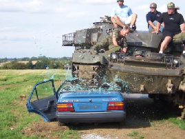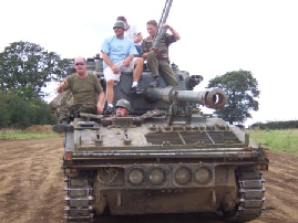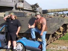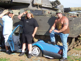 American Chopper We were asks if a bunch of yanks could come over with a film crew to mess about with tanks and stuff it was pretty good money and it fitted nicely between some big corporate days the clients were Orange county chopper. Never heard of them but who cares ,a couple of days before they were coming i mentioned it to my chaps at the wind down of a big tank day and one went mad with excitement then they all started jumping about calling me a liar.Was i the only person not watching American chopper on cable. Turns out these guys are bigger than swartsanigger in the states build the most expensive choppers on earth and have their own TV series were the dad paulie and his sons little Pauli and mike are always fighting and smashing things up .One of my chaps got me a DVD the night before they were arriving, oh shit what have i let myself in for demolition derby tank day. Turned out i couldn’t have been more wrong real good old boys drove great even let them loose with shotguns on! the radio control plane shooting stand, big Pauli shot well blew one plane out of the sky after it had nearly given the camera man a haircut, but a great day and i cant wait to see the next series ,it should be out June 06 |