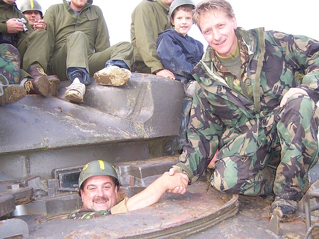 Full Monty Day - 26th August 2006 The weather looked dodgy and we had a bid day, with the spectators who all need transporting about to the various stands i reckoned the head count was 135 .All you could hear was exited laughter as people booked in and were having rides in hagglunds .The instructors were also fired up ,on the previous Thursday we ran over Rebecca loos Audi with the LIMOTANK outside Kerrang radio at 1,00 in the morning and had a few of naked glamour models in the Jacuzzi and things were just starting to appear in the papers ,But that’s another story. We had also had Liz Kershaw of the radio to fix a grandmothers life long ambition to drive a tank her name was Margret and she managed to tip the first vehicle she drove on its side .A first for us and i guess for her, but no harm done and lots of leg pulling except Tim the instructors leg which was i believe was badly Soiled .It was like an audition for the next bond movie .But on the whole excellent driving Michel lent won the car crus! h but i kind of already knew this was not to be a girl power day. We had young and old and even a bunch of Belgians and some people from Ireland, Ow yes and an American couple who im afraid took some flack from sas Colin and John on the 18th century stand he calls them damn Yankee rebels and spits on the ground .Loves them really though especially when brunet and beautiful see if you can spot her. |
